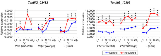 Expression profiles of genes that revealed the maximum level at the second time point in the 75A:258 line. The numbers 1, 5, 9, 16 and 23 stand for days post inoculation. LanDExH7 and LanTUB6 were used for the normalization, and LanTUB6 dilution was used for inter-run calibration. The error bars indicate the standard deviation of three biological replicates, each representing a mean of three technical replicates. The statistical significance of differences in the expression levels between the inoculated and control plants are marked above data points (* p-value ≤ 0.05, ** p-value ≤ 0.001). A logarithmic scale was used to accommodate the observed differences in gene expression. Analyzed lines of Lupinus angustifolius: 75A:258 (highly resistant, carrying the Phr1 gene), Wonga (moderately resistant, carrying the PhtjR gene), and Emir (susceptible).