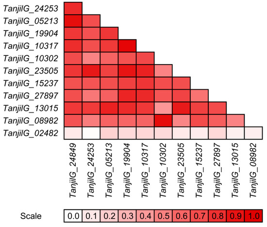 Interestingly, some gene pairs revealed very similar expression profiles, both in the context of observed trends during the experiment, as well as revealed differences in expression levels between genotypes and variants (control and inoculated). Such similarities, visualized using high Pearson correlation coefficients, were identified for the following pairs: TanjilG_10317 and TanjilG_19904 (correlation of 0.95), TanjilG_05213 and TanjilG_24849 (0.92), TanjilG_08982 and TanjilG_10302 (0.92), TanjilG_23505 and TanjilG_24253 (0.89), TanjilG_23505 and TanjilG_19904 (0.89), TanjilG_23505 and TanjilG_13015 (0.88), TanjilG_23505 and TanjilG_10317 (0.85), TanjilG_13015 and TanjilG_05213 (0.85), TanjilG_27897 and TanjilG_19904 (0.84), and a few other combinations (Figure 6).