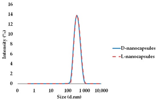 DLS measurements were performed and revealed the average size of 386.5 ± 1.8 nm and 363.9 ± 2.1 nm for the d- and l-nanocapsules, respectively, showing an increase in diameter of approximately 50 nm and 10 nm for the d- and l-nanocapsules, respectively (Figure 5).