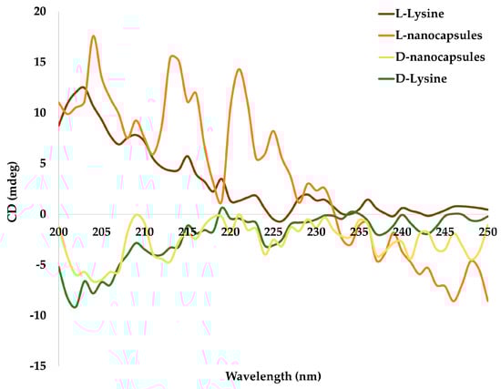 It was expected that the incorporation of the chiral amino acid (d- or l-lysine) will control the final polymeric shell configuration and, thereby, the overall chirality of the capsules. This was confirmed by the chiral optical activity of the nanocapsules (Figure 3). Circular dichroism (CD) spectroscopy revealed that the spectra of d- and l-lysine-containing nanocapsules showed strong negative and positive signals, respectively, and correlated well with their corresponding free amino acid enantiomer spectra (Figure 3).