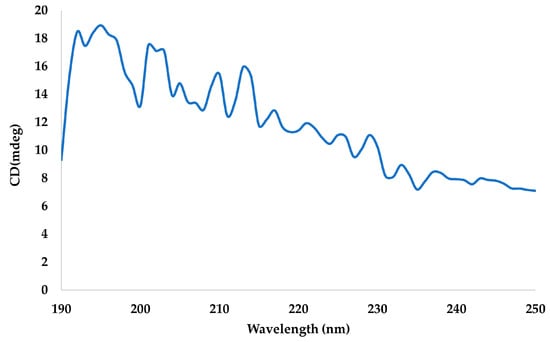 Circular dichroism (CD) measurements were performed with an MOS-500 spectrometer (BioLogic, Seyssinet-Pariset, France). The measurements were performed over a wavelength range of 200–250 nm, using a 1 cm path length cuvette. The spectral resolution was 1 nm. The reported spectra are the results of 3–5 scans.