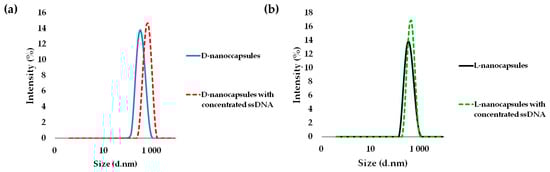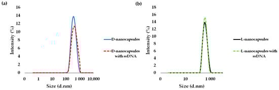 As shown in Table 1, the initial ζ-potentials of the d- and l-nanocapsules were very similar in value (approximately −1 mV), which can be considered neutral potential. After the addition of 0.25 nM of the ssDNA solution, both types of chiral nanocapsules became negatively charged, however, the ζ-potential values were −9 mV and −21.3 mV for l- and d-nanocapsules, respectively, which indicates a preferential adsorption of the negatively charged ssDNA [] on the d-nanocapsule surface. To verify this effect, a concentrated solution of ssDNA (25 nM final concentration) was added to the chiral systems. The molar ratio between the ssDNA and the nanocapsules was increased 100 times. DLS measurements were performed after the system equilibration and showed a significant increase in size for the d-nanocapsules of almost 400 nm (new average size was 711 ± 2.2 nm), and a much more moderate increase in size—of approximately 100 nm—for the l-nanocapsules (new average size was 454 ± 2.6 nm) (Figure 6).