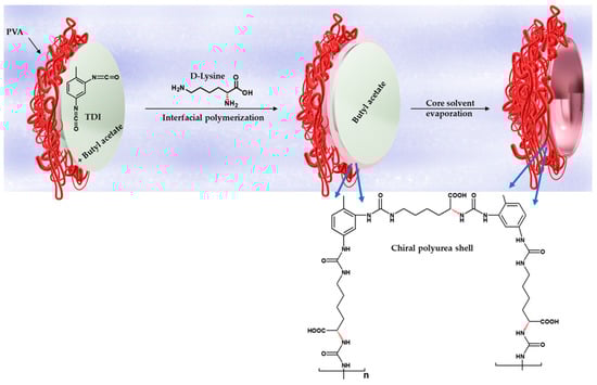 The chiral capsules in the submicron size range (further referred to as “nanocapsules”) were prepared by interfacial polymerization in emulsion followed by volatile solvent evaporation. The chirality was controlled by the addition of two enantiomers of lysine amino acid to the capsule shell. l- or d-lysine was introduced to the oil-in-water emulsion system containing toluene 2,4-diisocyanate (TDI) monomers dissolved in n-butyl acetate as the organic phase, and distilled water with dissolved polyvinyl alcohol (PVA, nonionic polymeric surfactant) as the aqueous phase. Ultrahigh sonication was first applied to the system to disperse the organic phase as nanometric droplets. Either an l- or a d-lysine enantiomer was then added to this system, and an interfacial polyaddition reaction occurred upon the encounter between oil-soluble TDI monomers and water-soluble lysine at the oil droplet interface. The system was kept under slight heating at 35 °C overnight to evaporate the volatile solvent and to form the final chiral d- or l-polyurea nanocapsules. The synthesis of d-polyurea nanocapsules is depicted in Scheme 1. The same synthesis procedure using the l-lysine enantiomer led to the formation of l-polyurea nanocapsules.