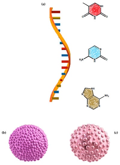 Illustrations of (a) 5′-ACA TCT TCTTCT CCC AT-3′ single stranded DNA structure, (b) Possible l-polyurea nanocapsule morphology and (c) Possible d-polyurea nanocapsule morphology. Please see the Discussion section for further explanation about this illustrative presentation.