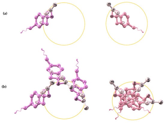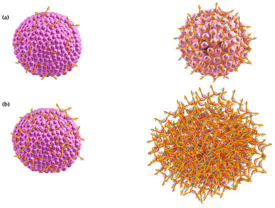 Illustrations of: (a) single stranded (ss)DNA adsorption from a dilute solution onto an l-nanocapsule (left) and a d-nanocapsule (right); (b) ssDNA adsorption from a concentrated solution onto an l-nanocapsule (left) and a d-nanocapsule (right). Chiral nanocapsules and DNA are not drawn to scale.