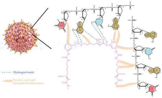 An illustration of some of the suggested interactions between the single stranded (ss)DNA oligomer and the chiral nanocapsule polyurea shell. Chiral nanocapsules and DNA are not drawn to scale.
