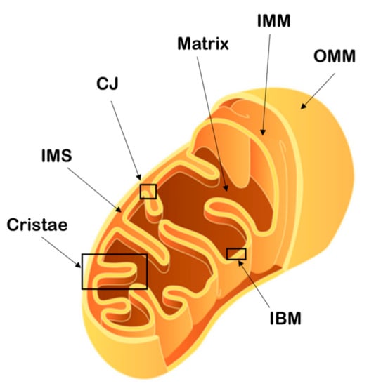 Mitochondria are surrounded by two phospholipidic membranes, the outer mitochondrial membrane (OMM) and the inner mitochondrial membrane (IMM), which divide the organelle into two spaces, the matrix and the intermembrane space (IMS) []. The two membranes present significant differences in lipid composition, characteristics and roles of the transmembrane proteins, permeability and shape and are the result of the endosymbiotic origin of the organelle. Indeed, the OMM is more similar in lipid composition to eukaryotic cell membranes, while the IMM resembles the cardiolipin-containing bacterial membranes []. The IMM is characterized by a higher protein/lipid ratio and forms highly packed invaginations in the matrix, called cristae []. Embedded in the cristae resides, together with many other proteins, the oxidative phosphorylation (OXPHOS) machinery and one proposed reason for the IMM folding is to increase the available surface for energy production. The part of the IMM that does not protrude in the matrix but, instead, runs parallel to the OMM is called the inner boundary membrane (IBM). Cristae and the IBM are connected via narrow tubular or slit-like structures, the cristae junctions (CJs) [] (Figure 2).