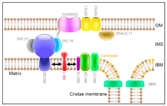 The Mic60/Mic19 module is also associated with the OMM. Indeed, Mic19 has been shown to form a bridge between Mic60 and Sorting Assembly Machinery 50 kDa subunit (SAM50), the outer membrane protein that regulates the import and assembly of β-barrel proteins [], creating tight OMM and IMM contact sites. Other proteins have been specifically associated with this OMM–IMM junction such as Metaxin-1 and 2 (Mtx1/Mtx2) and DnaJ homolog subfamily C member 11 (DNAJC11) []. These OMM–IMM interactions create a specific environment of closed apposition of the two membranes favorable for protein import and lipid and phospholipid transport [].