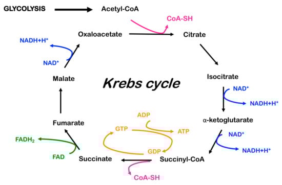 To optimize ATP production, glycolysis is coupled to a second pathway, known as the citric acid cycle (or tricarboxylic acid cycle or Krebs cycle, Figure 4), which takes place in mitochondria and is aerobic. This cycle is composed of nine different enzymatic reactions and each round generates three nicotinamide adenine dinucleotide (NADH) molecules, one flavine adenine dinucleotide (FADH2) and one guanosine triphosphate (GTP). One molecule of glucose is catabolized by glycolysis into two molecules of the ketoacid pyruvate. Pyruvate enters through the mitochondrial pyruvate carrier (MPC) into the mitochondrial matrix [], where it is decarboxylated, oxidized and coupled with coenzyme A by pyruvate dehydrogenase, PDH, to form acetyl-CoA. Thus, the two glucose-derived acetyl-CoA molecules in the mitochondrial matrix lead to a complex catabolic cycle, the Krebs cycle, which gives rise to two molecules of CO2, whereas their electron equivalents (hydrogen atoms) are stripped off and used to produce, in total, six NADH, two FADH2 and two GTP.