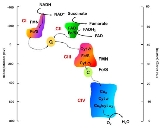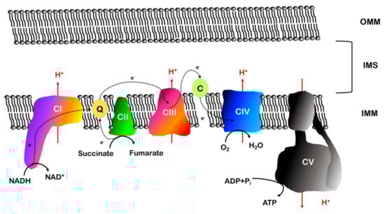 The enzymatic machinery performing cellular respiration, the electron transport chain (ETC), is composed of four protein complexes embedded in the IMM and two mobile electron carriers (ubiquinone, or coenzyme Q, and cytochrome c) (Figure 5). Electrons are transported from electron carriers reduced during glycolysis and the Krebs cycle (NADH and FADH2) to coenzyme Q and cytochrome c and eventually transferred to O2, forming H2O. The energy liberated by this chain of redox reactions leads to the generation of an electrochemical proton gradient across the IMM, which is used by complex V or F1Fo ATP synthase to generate ATP [,].
