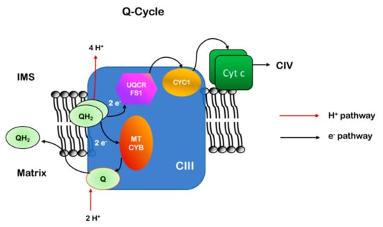 Coenzyme Q is a mobile cofactor that can interact with CI and CII and transports the electrons received to complex III (CIII, Q-cytochrome c oxidoreductase). CIII oxidizes QH2 to Q and passes the electrons to another soluble carrier, cytochrome c, during a process known as the Q-cycle (Figure 7). The Q-cycle consists of two parallel reactions, which involve the three prosthetic groups of the enzyme: the heme groups contained in cytochrome c1 and cytochrome b and the 2Fe/2S cluster contained in the Rieske protein/UQCRFS1 []. The first reaction requires the passage of one electron from QH2 bound to the Qo binding site to the iron/sulfur group and then to cytochrome c1, leading to the reduction of cytochrome c. Each cytochrome c is able to bind only one electron and, when reduced, moves from CIII to complex IV (CIV, cytochrome c oxidase). The second electron from QH2 is passed to the two heme b groups (bL and bH) contained in cytochrome b and terminates on a second ubiquinone molecule bound to a different binding site of the enzyme (Qi site). This ubiquinone is partially reduced to a semiquinone (Q−•) during the first Q-cycle and completely reduced to QH2 following a second catalytic cycle [,,,]. One QH2 molecule is then recycled and two electrons are eventually passed to two cytochrome c molecules. For each QH2 molecule that is oxidized, there is the release of two protons to the intermembrane space. QH2 has a redox potential around 0 mV, while CIII centers have a positive potential, allowing the passage of electrons. In order to permit the two branches of the Q-cycle, different centers of CIII must have different redox potentials, ranging between 72.5 mV for cytochrome b, low enough to allow the recycling of electrons through semiquinone, and 242 mV for cytochrome c1, which passes the electron to cytochrome c (251 mV) [,].