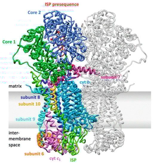 - Hartley, A.M.; Lukoyanova, N.; Zhang, Y.; Cabrera-Orefice, A.; Arnold, S.; Meunier, B.; Pinotsis, N.; Maréchal, A. Structure of yeast cytochrome c oxidase in a supercomplex with cytochrome bc(1). Nat. Struct. Mol. Biol. 2019, 26, 78–83. [Google Scholar] [CrossRef]