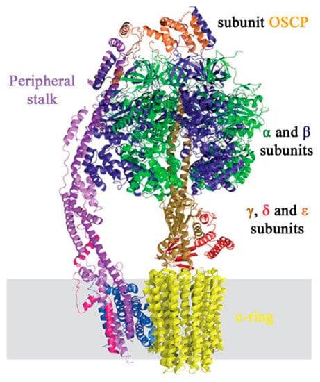 - Kuhlbrandt, W. Structure and Mechanisms of F-Type ATP Synthases. Annu. Rev. Biochem. 2019, 88, 515–549. [Google Scholar] [CrossRef]