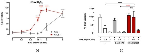 N-acetyl-L-cysteine ethyl ester (NACET) protects retinal pigment epithelium (RPE) cells from oxidative stress. Confluent ARPE-19 RPE cells were treated with increasing concentrations of N-acetyl-L-cysteine (NAC) or NACET for 24 h before viability was measured. Then, 2 mM H2O2 (a) or 0.5 or 1 mM tert-Butyl hydroperoxide (t-BOOH) (b) were added 30 min after beginning of NAC or NACET treatment. The percentage refers to 100% viability of untreated cells (mean ± SD, number of replicates = 3). The p-values for the comparison of treated vs. untreated cells (point 0) are indicated in black, while p-values for comparison between cells treated with equal concentrations of NAC or NACET are indicated in red (** p < 0.01; **** p < 0.0001; ns, not significant).