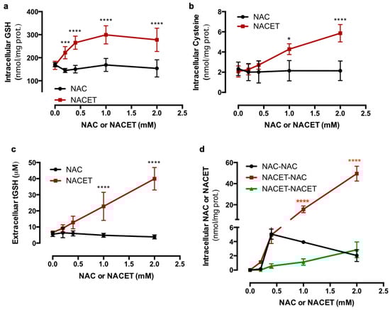 NACET strongly increases the intracellular glutathione (GSH) content in RPE cells. ARPE-19 RPE cells were treated for 16 h with increasing concentrations of NAC or NACET and intracellular concentrations of GSH (a), cysteine (b), and NAC and NACET (d), and the extracellular concentrations of total GSH (tGSH) (c) were measured. The intracellular thiol concentrations were normalized to the concentration of total proteins (mean ± SD, number of replicates = 3). The p-values for the comparison of the treated vs. untreated cells (point 0) are indicated in black, while the p-values for the comparison between the cells treated with equal concentrations of NAC or NACET are indicated in red. * p < 0.05; *** p < 0.001; **** p < 0.0001.