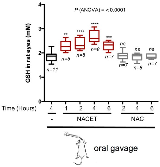 NACET strongly increases the intracellular GSH content in rats’ eyes. The levels of the GSH concentration in the eyes were measured at the indicated time points after oral administration of 50 mg/kg of NAC, NACET, or the vehicle alone. The concentrations were normalized to eye volumes. Data are presented as box and whisker plots displaying the median, lower, and upper quartiles (boxes) and the minimum–maximum (whiskers). Asterisks indicate significant differences (p-values) between the data in control animals (gavaged water only; “-”) and each treatment. n, number of eyes analyzed; ** p < 0.01; *** p < 0.001; **** p < 0.0001; ns, not significant differences.