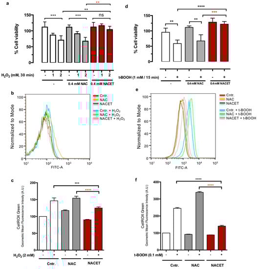 NACET pretreatment predisposes RPE cells to oxidative stress resistance. Cells were incubated for 16 h with NAC or NACET, washed with phosphate-buffered saline solution (PBS) and treated with H2O2 for 30 min (a–c) or with t-BOOH for 15 min (d) or 1 h (e,f) at the indicated concentrations. Viability was measured after 16 h (a,d) (mean ± SD, number of replicates = 3). The p-values for the comparison of the treated vs. untreated cells (point 0) are indicated in black, while the p-values for the comparison between the cells treated with equal concentrations of NAC or NACET are indicated in red. Ns, not significant differences. (b,c,e,f) The reactive oxygen species (ROS) content was measured by CellROX Green dye staining and FACS analysis immediately after H2O2 or t-BOOH treatments (mean ± SD, number of replicates = 3). ** p < 0.01; *** p < 0.001; **** p < 0.0001.