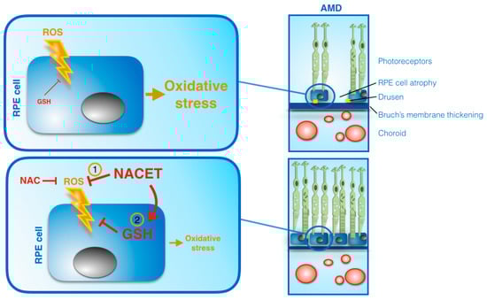 Taken together, all of these observations suggest that NACET, or other ester derivatives of NAC, by directly reacting with ROS and through an increase of GSH in the eye, may represent a pool of promising weapons against oxidative stress that induces AMD or other degenerative photoreceptor diseases (Figure 6). Targeted experiments in animal models of such diseases are still missing and are urgently needed to investigate the impact of these drugs on the prevention and/or suppression of the progression of degenerative retinal diseases.