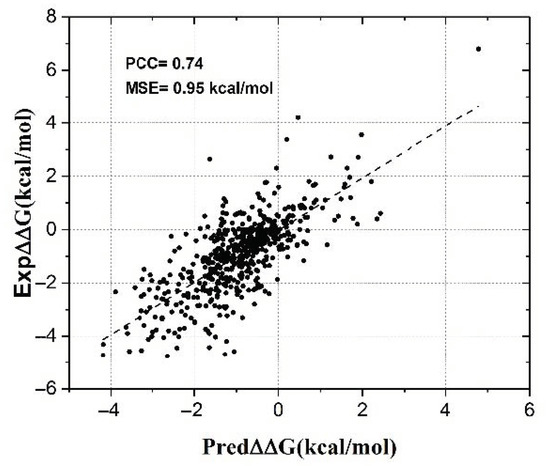 We also tested SAAFEC-SEQ on the S276 dataset, which consists of 276 single mutations in 37 different proteins. This blind set was collected from Cao’s study [29] and it was not used in our training set or validation. Since the previous studies [25,29] reported a mean absolute error (MAE), we also applied MAE as a measurement of the performance. Table 2 represents a prediction comparison in the form of PCC and MAE obtained using different ΔΔG predictors along with SAAFEC-SEQ. The PCC and MAE values, achieved by other methods, are taken from a previous paper [25]. As Table 2 shows (fourth and fifth columns), BoostDDG achieves the highest PCC of 0.51, although a PCC of 0.51 is not impressive at all. SAAFEC-SEQ PCC is not impressive either (PCC = 0.46). However, other methods also do not perform well. However, SAAFEC-SEQ MAE = 0.89 is the second-lowest.