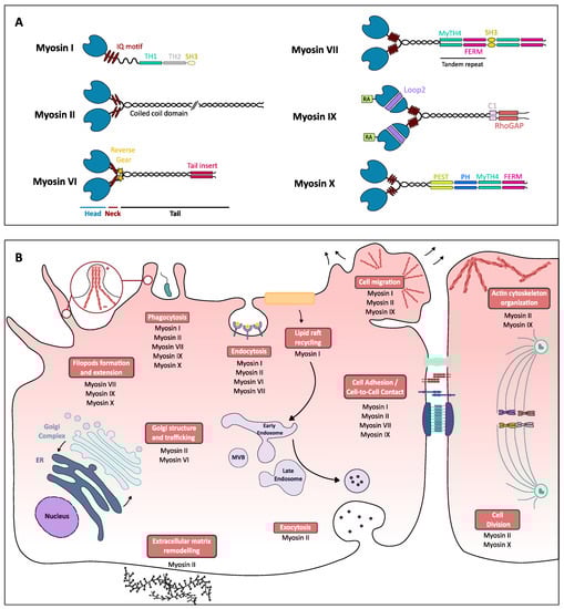 Myosins structure and functions in eukaryotic cells. (A) Schematic structure of different classes of myosins. Myosins are all composed of three distinct parts, the head, neck and tail regions. The head (in blue) is the most conserved region as it contains the motor domain as well as the ATP- and actin-binding domain. Class IX myosin head is preceded by a unique extension, an Ras-associated (RA) domain. The neck can vary in the composition in IQ motifs (red ellipses) able to bind different regulating molecules such as the myosin light chains or calmodulin. In the class IV myosin neck region, the stars represent an insertion called the reverse gear that permits the myosin VI to walk in the opposite direction as other myosins. The tail (in black and colored boxes), the most variable domain, is the region where coiled-coil domains can be found, ensuring myosins dimerization, as well as other specific domains that can bind different cargos, which can be related to myosins’ cellular functions: myosin tail homology 4 (MyTH4) domain-binding cytoskeletal proteins such as microtubules, four-point-one, ezrin, radixin, moesin (FERM) domain, mostly found in cytoskeletal-associated proteins, that allows proteins to bind membrane proteins, SH3 (Src homology 3) domain-binding to adaptor proteins or phosphorylated tyrosine residues, C1 or phorbol esters/diacylglycerol-binding domain, Rho GAP-domain-binding Rho GTPases, PEST region found on proteins with short half-life and Pleckstrin homology (PH) domain, allows proteins to bind to phosphoinositids and therefore to the plasma membrane []. Class I myosins can present short-tail (continuous line) or long-tail isoforms (discontinuous line) thanks to supplementary domains. (B) Schematic representation of cellular processes (boxed in red) and the associated myosins. This representation is not exhaustive of all the roles of myosins.