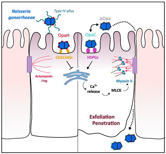 N. gonorrhoeae has been shown to adhere to epithelial cells by its type IV pilus [] and surface proteins, such as OpaH and OpaC that bind Carcinoembryogenic antigen-related cell adhesion molecule (CEACAMs) proteins and heparan sulfate proteoglycans (HSPGs), respectively [,]. After adhesion, the bacteria promote apical junction disassembly and subsequent exfoliation of epithelial cells, thereby increasing the permeability of the epithelium, which allows them to cross this physical barrier and invade the reproductive system. It has been shown that myosin II plays a role in mediating epithelial cell exfoliation, thus promoting N. gonorrhoeae infection []. Specifically, N. gonorrhoeae infection induces Ca2+ cytosolic release, as observed by the monitoring of two fluorescent Ca2+ level indicators, which in turn activates MLCK. MLCK is responsible for the increase in the phosphorylation level of myosin light chain (MLC), and therefore for the localization of myosin II at apical sites enriched in bacteria. This localization, observed by microscopy, could trigger endocytosis of E-cadherin from apical junctions, thus causing apical junction disassembly [] (Figure 3). Noteworthy, the bacterial Opa proteins, specifically OpaH that binds CEACAMs proteins, are submitted to phase variation, i.e., a genetic control that induces ON/OFF expression [], and therefore negatively regulates myosin II-mediated disassembly of apical junctions and reduce cell exfoliation. Together, these data show an indirect interplay between N. gonorrhoeae adhesion and myosin-II, which contributes to the colonization of endocervix tissue by bacteria.