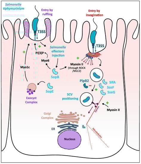 Entry is not the only step of the Salmonella infectious cycle requiring myosins. Once internalized through Arp2/3-mediated membrane ruffles and/or myosin II-mediated stress fiber-like structures, S. typhimurium triggers the biogenesis of its replicative niche, an intracellular vacuole called Salmonella-containing vacuole (SCV). For Salmonella replication to start, the SCV needs to traffic and localize near the perinuclear region close to the Golgi apparatus. This positioning of the SCV is mediated by the second T3SS, SPI-2 that upon acidification of the vacuole injects inside the host cell, several effectors: SseF and SseG that recruit dynein, allowing transport of the SCV along microtubules to the nucleus [,]; PipB2 that promotes kinesin accumulation to the SCV for centrifugal extension of membranous Salmonella-induced filaments (Sifs) []; SifA that uncouple kinesin molecules from the SCV to prevent displacing SCV further from the nucleus []. At the perinuclear region, the SCV matures to avoid cellular degradation and intracellular bacterial replication starts [] (Figure 4). Myosin II is required for the good positioning of the SCV near the nucleus, as myosin II inhibition by blebbistatin, and expression of a negative dominant of myosin II light chain that cannot be phosphorylated, leads to a peripherical dispersion of the SCV and inhibits intracellular growth of S. typhimurium []. As described for Salmonella entry, myosin II has been shown to be activated by SopB, through ROCK which is known to indirectly promote phosphorylation of myosin II light chain and, therefore, promotes myosin II activation []. Thus, myosin II could regulate the equilibrium between dynein and kinesis forces and counteract the PipB2 activity in order to prevent centrifugal displacement of the SCV. Hence, the two modes of S. typhimurium entry, namely “zip” invasion and invagination, but also the biogenesis of its replicative niche require indirect interactions between bacterial T3SS effectors and myosins, that involve well-known actin cytoskeleton controlling pathways.