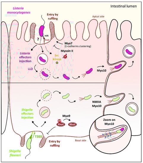 Listeria monocytogenes belongs to foodborne bacteria such as S. typhimurium or S. flexneri that invade epithelial host cells by triggering their entry inside these cells. The entry of L. monocytogenes is mediated by two surface proteins called internalins A and B (InlA and InlB) that bind cell receptors and subsequently trigger actin polymerization and cell membrane remodeling []. While InlB interacts with the Met receptor to trigger Listeria entry, InlA specifically interacts with the E-cadherin protein, thus leading to the activation of Src kinase and cognate tyrosine phosphorylation, and finally, allows cytoskeleton rearrangement through the recruitment of the actin nucleator complex Arp2/3 [,]. However, another cytoskeleton-associated protein, namely Myo7a and its interaction with vezatin, would also be involved in this process, as inhibition of Myo7a with BDM leads to the defect of entry of the bacteria. The Myo7a tail domain is required for the recruitment of Myo7a at the internalization site, and plus-end motor activity of Myo7a contributes to Listeria entry, specifically in steps that follow the early clustering of Listeria engaged E-cadherin receptors on the plasma membrane [] (Figure 5). Moreover, NMIIA has been depicted as a regulator of Listeria entry inside HeLa cells as the Src kinase triggers the phosphorylation of NMIIA heavy chain on Tyr158 that results in fewer bacteria uptake [] (Figure 5). Thus, indirect interactions with Myo7a and NMIIA finely control the invasion of epithelial cells by Listeria.