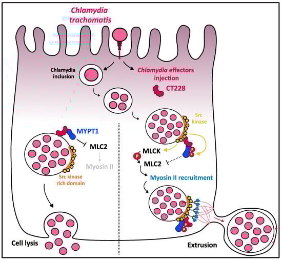 In the late stages of infection, inclusions are characterized by transient septation and a peripherical location accompanied by outward budding, described as the extrusion exit mechanism. Actin polymerization and myosin-II are required for extrusion formation, as latrunculin B and blebbistatin-treated HeLa infected cells showed inhibition of extrusion formation. Inhibition of Rho GTPase also results in the arrest of extrusion formation at the “pinching” step []. Importantly, actin is recruited at the cytosolic face of inclusion membranes in Chlamydia-infected HeLa cells by a process involving septins, myosin II and Src-family kinase (SRK) on the host side and the T3SS-mediated injection of bacterial effectors on the other side []. Specifically, the C-terminal domain of the C. trachomatis Inc protein CT228 interacts with the leucine-zipper domain of the myosin phosphatase target subunit 1 MYPT1, resulting in colocalization of CT228 and MYPT1 at the inclusion membrane []. MYPT1 is recruited earlier during the infection, but MYPT1 appears progressively relocated in an inactive T696- and T853-phosphorylated state at inclusion membrane microdomains enriched with Src-family kinase (Figure 6). MYPT1 phosphorylation was shown to inhibit its phosphate activity, thus leading to the loss of interaction with its target myosin light chain 2 (MLC2) [], and consequently to the activation of myosin II motor domain and the formation of extrusion to promote the exit of Chlamydia (Figure 6). As MLCK is known as a positive regulator of MLC2, an antagonistic role of MLCK/MYPT on the activation state of MLC2 could be suggested to control the balance between extrusion signals (generated by active-MLC2) and lysis signals (generated by inactive-MLC2) []. Thus, the MYPT1/MLC2/myosin II pathway finely regulates the balance between the two modes of Chlamydia exit from the cell.