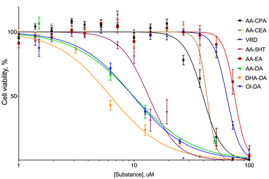 The cytotoxicity of the synthesized fatty acid esters and ethers for the undifferentiated PC12 cell line, 24 h incubation time, MTT assay. n = 5 experiments, M. ± S.E. AA-CPA, N-arachidonoyl cyclopropyamine, AA-CEA, N-arachidonoyl 2-chloroethylamine, VRD, virodhamine, AA-5HT, N-arachidonoyl serotonin, AA-EA, anandamide, AA-DA, N-arachidonoyl dopamine, DHA-DA, N-docosahexaenoyl dopamine, Ol-DA, N-oleoyl dopamine.