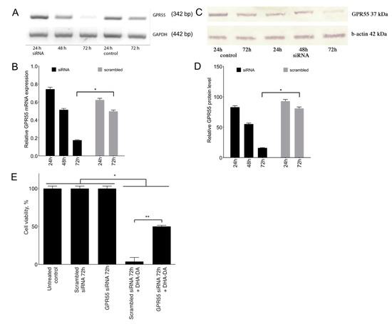 The cytotoxicity of DHA-DA was substantially decreased after the GPR55 siRNA knockdown (Figure 4), which is in line with our previous data on NADA cytotoxicity prevention by GPR55 antagonists and its pharmacological downregulation [29]. A scrambled siRNA control did not affect DHA-DA cytotoxicity, indicating that this indeed was a GPR55-based activity.