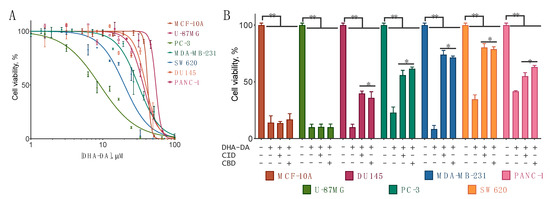 To validate the assumption that GPR55 participates in the DHA-DA cytotoxicity independently of the cell line, we tested the cytotoxicity of the substance on a panel of human cancer cell lines, chosen to represent different tissues: breast cancer MDA-MB-231, glioblastoma U-87 MG, pancreatic cancer PC3, PANC-1, and DU-145, colon cancer SW620, and a nontumorigenic epithelial cell line MCF-10A. The acute cytotoxicity was evaluated after a 24 h incubation with MTT assay detection. DHA-DA induced cell death in all cell lines tested with a general tendency of higher cytotoxicity in the cell lines with GPR55 receptor blocker activity (Figure 5A, Table 3). Given that MCF-10A could be considered as a noncancer control cell line, in all further experiments the DHA-DA concentration was chosen so as not to be toxic for this cell line (i.e., below 40 µM). The cytotoxicity was partially prevented by the GPR55 receptor blockers CID16020046 and cannabidiol (Figure 5B). These data indicated that GPR55 indeed played a significant role in DHA-DA cytotoxicity. However, the cytotoxicity inhibition by the receptor blockers was only partial, pointing to the participation of other receptors in DHA-DA cytotoxicity.