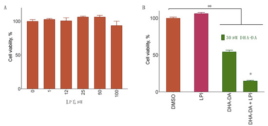 Lysophosphatidyl inositol (LPI) interplay with N-docosahexaenoyl dopamine (DHA-DA) on MDA-MB-231 cells in the cell viability model. (A), the influence of LPI on MDA-MB-231 cells viability. (B), the influence of LPI (50 µM) on DHA-DA cytotoxicity for MDA-MB-231 cells. 24 h incubation, MTT assay, mean ± S.E., n = 3 experiments. *, a statistically significant difference from the appropriate concentration of DHA-DA alone, **, a statistically significant difference from the DMSO control, ANOVA with the Tukey post-test, p ≤ 0.05.