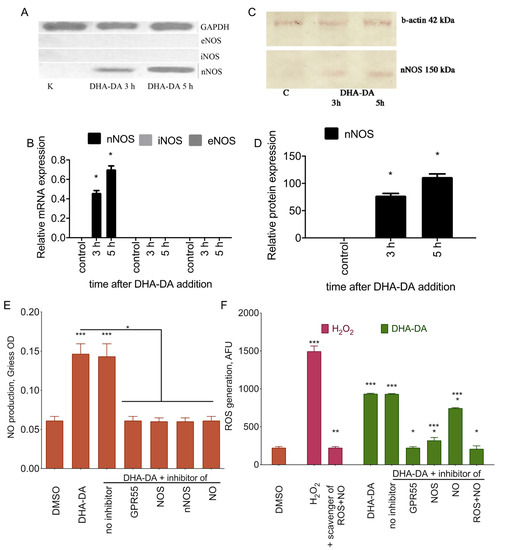 The next question of the study was: what is the molecular mechanism of the apoptosis induction by GPR55 activation by DHA-DA? Earlier we observed that cell death induction by NADA could be blocked by GPR55 antagonists [29]. NADA also stimulated oxidative stress with NO and reactive oxygen species (ROS) generation in the process, and the removal of both ROS (reactive oxygen species) and NO prevents cytotoxicity [30,31]. We hypothesized that there could be a causative link between GPR55 activation and ROS and NO generation during the apoptosis induction by NADA. To test this hypothesis, we evaluated ROS and NO production after DHA-DA application with the blocker of GPR55; DHA-DA combinations with the inhibitors of NOS, nNOS (neuronal NO synthase), and ROS or NO scavengers were included as a control, and PC12 cells served as the model. DHA-DA treatment induced nNOS expression (Figure 7A–D), and the application of the GPR55 blocker did prevent both ROS and NO production (Figure 7). In this work, we used nondifferentiated PC12 cells as a model. According to the literature data, neither eNOS (endothelial NO synthase), nor iNOS (inducible NO synthase) are expressed in such cells [32,33]; they only appear after a treatment with the differentiation inducting stimuli [34]. As far as no mRNA expression of other NO synthase isoforms was detected, and the DHA-DA stimulated production of NO was completely prevented by the inhibitor of nNOS, no further analysis of other NOS isoforms was performed. Therefore, GPR55 activation by DHA-DA, indeed, leads to NOS activation and NO and ROS production.