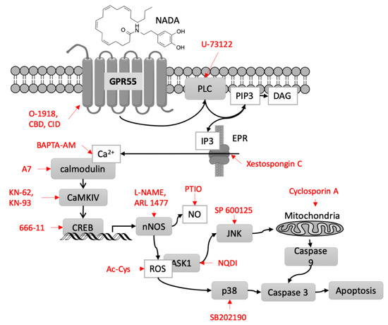 Proposed signal transduction during the cell death induction by endovanilloid DHA-DA. Inhibitors used in the work are shown in red. nNOS, neuronal NO synthase, JNK, c-Jun N-terminal kinase, ASK1, Apoptosis signal-regulating kinase 1, CBD, cannabidiol, CREB, cAMP response element-binding protein, EPR, endoplasmic reticulum, PIP3, Phosphatidylinositol (3,4,5)-trisphosphate, DAG, diacylglycerol, PLC, phospholipase C, IP3, Inositol trisphosphate, CaMKIV, Calcium/calmodulin-dependent protein kinase type IV, NADA, N-acyl dopamines.