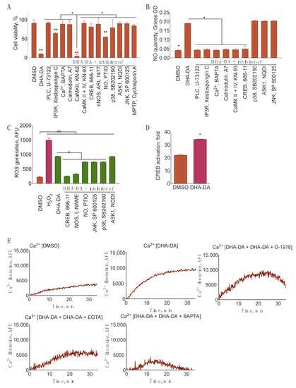 To check the order of the subcellular target activation, several measurements were performed: cytotoxicity (expected to be decreased with the inhibitor of any cellular component, participating in cell death induction), NO generation (expected to be decreased for the components upstream of NOS inhibition), and ROS generation (expected to be decreased for the NOS and upstream components inhibition). In addition, we included the inhibitors of several ROS-sensitive kinases, participating in cell death induction (c-Jun N-terminal kinase (JNK), p38, and apoptosis-signal regulated kinase 1 (ASK1)) and mitochondrial permeability transition pore (MPTP) inhibitor, and directly measured the characteristic of inositol triphosphate receptor (IP3R) activation Ca2+ response and cAMP response element-binding protein (CREB) activation (Figure 9). Most blockers, except for KN-62 (calcium/calmodulin activated kinase II, CaMKII), prevented DHA-DA cytotoxicity, but only those upstream of NO generation prevented NO and ROS accumulation, which agreed with the hypothesis (Figure 5, Figure 9A–C). CREB activation was detected as expected (Figure 9D). Intracellular Ca2+ level was increased after the DHA-DA treatment. BAPTA and EGTA prevented this increase only partially, and GPR55 blocker O-1918 reduced the duration of the increased Ca2+ concentration presence in the cells (Figure 9E).