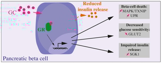 In vitro, the majority of studies show a negative effect of GCs on the secretion, proliferation, as well as on the survival of beta cells. Meanwhile, the signaling pathway altered in beta cells are still not well known [] (Figure 1). A study on isolated human and murine islets as well as on Min6 cells (a mouse pancreatic beta cell line) shows that addition of DEX or prednisolone leads to a decrease in cell viability via activation of the p38 MAPK/TXNIP pathway and that this effect was reversed by the blockade of the GR []. More studies on DEX-induced beta cell apoptosis show several pathways involved in response to GR activation in beta cells [,,,]. In vitro, beta cell insulin secretion is severely impacted by GC exposure. DEX impairs beta cell response to glucose by decreasing GLUT2 protein level, by a post-translational mechanism [], but also the insulin release: the upregulation of transcription and expression of SGK1 increases repolarizing activity of K+ channels, reducing then Ca2+ channels activity and insulin vesicles exocytosis []. Accordingly, INS1 (a rat pancreatic beta cell line) treatment with prednisolone results in an induction of endoplasmic reticulum stress and impaired insulin biosynthesis and release. Prolonged exposure to GC induces the unfolded protein response (UPR) and, in fine, beta cell apoptosis []. However, a recent study further described the negative impact in vitro of GC treatment. Fine et al. showed in human and murine isolated islets treated with GCs that the suppression of the calcium channel activity did not impaired insulin secretion or beta cell response to glucose. In fact, they identified an enzymatically amplified feedback loop whereby GCs boost cAMP to maintain insulin secretion in the face of perturbed ionic signals []. They also emphasized that lipotoxicity prevented this cAMP increase by GCs, thus suppressing insulin secretion improvement. Knowing that systemic supraphysiologic GC levels lead to lipolysis and dyslipidemia, it is important to consider integrated systems to better apprehend influence of GCs on beta cell function.