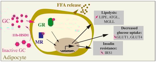 Effects of GC on adipocytes. Inactive GC are activated through the action of the specific enzyme 11b-HSD1. GCs can then bind to their receptors (GC receptor, or GR) or to the mineralocorticoid receptor (MR). The overall action of GCs on mature adipocytes leads to an increase in lipolysis (augmented LIPE, ATGL, and MGLL), a decrease in glucose uptake (decreased GLUT1 and GLUT4) and insulin resistance (reduced IRS1).