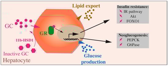 The physiological neoglucogenic role of GC is essential for the transition from an anabolic to a catabolic state, during fasting, but when their production is deregulated, or when the GR pathway is over-activated, the physiological actions are disrupted, leading to liver insulin resistance with glucose overproduction and increased blood glucose levels with an associated lipogenesis, causing hepatosteatosis. In the liver, the activation of the GC-GR signaling pathway inhibits the IR pathway and Akt activity and induces FOXO1, which in turn stimulates PEPCK and G6Pase expression and, ultimately, glucose production (Figure 3).