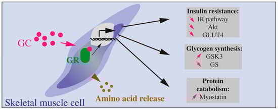 Muscles are major sites for glucose uptake, utilization, and storage (in the form of glycogen). Glucose is transported from the blood to the cytosol of muscle cells through the specific glucose transporter GLUT4. Upon insulin stimulation, GLUT4 enriched vesicles are very quickly translocated from the cytosol to the membrane, leading to increased GLUT4 density and glucose transport. Studies have previously demonstrated that GC decrease glucose uptake in skeletal muscles through the inhibition of GLUT4 translocation induced by insulin []. GC also reduces glycogen synthesis in muscle cells through suppression of the activity of glycogen synthase, the enzyme that catalyzes glycogen storage from glucose []. GC act on insulin signaling through the binding to their receptors as shown by studies revealing a strong correlation between GR mRNA levels in the muscle and insulin resistance in diabetic patients []. Moreover, treatment of diabetic patients to normalize insulin sensitivity also results in the normalization of GR expression in muscles, suggesting a strong link in between GR signaling and insulin sensitivity [,].