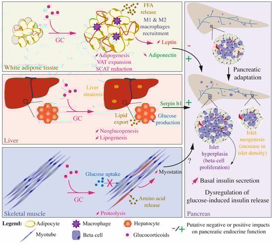 Integrated effects of glucocorticoids on glucose and lipid homeostasis and inter-organ communication. Impacts of GC treatment on the white adipose tissue, liver, and skeletal muscles, which are the main organs and tissues involved in the establishment of insulin resistance, as well as on the pancreas, which secretes insulin, are presented. Upon GC treatment, WAT, liver, and skeletal muscles develop insulin resistance but also influence each other and the pancreatic endocrine function through the secretion of peptides, adipokines, and myokines. Chronic exposure to GCs is associated with a pancreatic adaptation, characterized by an increase in basal insulin secretion, augmented beta cell proliferation leading to islet hyperplasia, and increased islet density, an indirect evidence of islet neogenesis.