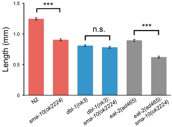 Adult body length of N2, sma-10(ok2224), dbl-1(nk3), dbl-1(nk3);sma-10(ok2224), eat-2(ad465) and eat-2(ad465);sma-10(ok2224) worms. At least 20 animals from a minimum of two independent experiments were synchronised and measured as described in Methods, and its final length were plot. Error bars indicate 95% confidence intervals. Not significant (n.s.) and significant statistical differences (*** p < 0.001) are indicated.