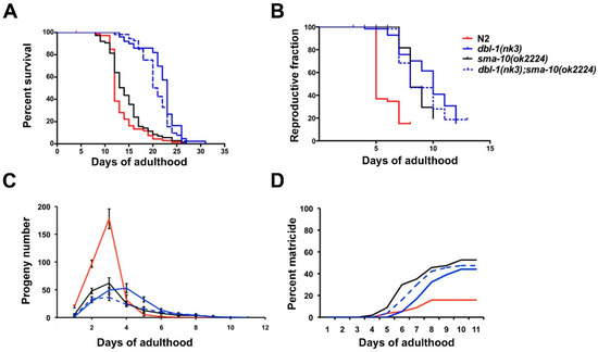 Although longevity and reproductive ageing are genetically coupled, a certain degree of dissociation between both has been described; so whereas mutations at the Sma/Mab pathway tend to affect both ageing processes, they alter reproductive span to a larger extent than life span [16]. That distinction is evident in our results with sma-10(ok2224), with a reproductive ageing similar to dbl-1(nk3) but, contrary to dbl-1(nk3), with a missing effect on longevity (Figure 3). Similar results were observed with two other Sma/Mab genes, sma-3 and sma-9 [16]. We noticed that the matricide was somewhat higher in sma-10(ok2224) than in dbl-1(nk3), and both notably larger than in N2 (Figure 3D). As indicated by [16], this may be due to lack of concomitance between somatic and reproductive ageing, forcing ageing mothers to give birth later in life, and therefore impinging a higher reproductive cost (matricide) in sma-10(ok2224) compared to dbl-1(nk3), and especially in comparison with the wild-type strain N2.