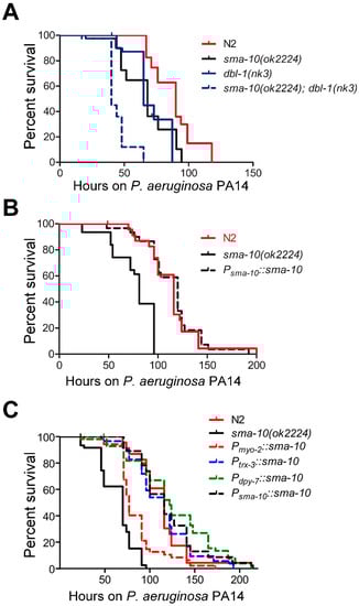 On the other hand, animals deficient in both dbl-1 and sma-10 further enhanced the susceptibility to PA14 (Figure 4A; Table S2), suggesting that SMA-10 plays an immunological role independently of the Sma/Mab pathway.