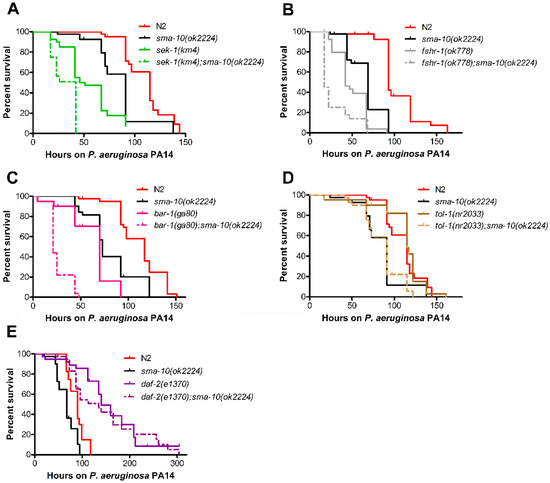 In an effort to identify the molecular mechanisms underlying the observed role of SMA-10 in PA14-mounted defence, we generated double mutant worms carrying deleterious mutations in both sma-10 and each of the following genes: sek-1 (Mitogen-Activated Protein Kinase Kinase, of the p38 MAPK pathway [22]); bar-1 (β-catenin, component of the innate immune response [23]); fshr-1 (leucine-rich repeat receptor [24]); and tol-1 (toll-like receptor [25]).