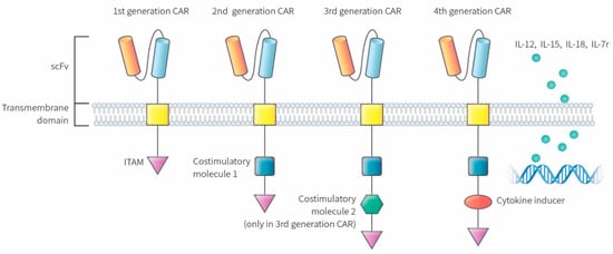 CARs are classified into four different classes depending on the molecular structure and complexity (Figure 1). The first-generation CAR consists of a simple receptor divided into the aforementioned components (scFv, a transmembrane domain, and intracellular zone). The first-generation CAR-T cells failed to obtain a significant number of activated T lymphocytes in blood circulation with this molecular arrangement, although enabling T cell activation was possible due to the absence of a costimulatory molecule [,,]. The second-generation CAR was engineered to overcome this clinical limitation by additionally inserting a costimulatory protein (CD 28, CD 27, CD 134, or CD B7) into the intracellular domain. Additional costimulatory molecular structures such as CD 28, 4-1BB, and CD 3ζ were inserted during the development of the third-generation CAR to increase the concentration of activated T cells in the circulatory system []. The T cells redirected for universal cytokine-mediated killing (TRUCKs), which has a costimulatory domain and pro-inflammatory construct, such as interleukin (IL)-12, which increases the effectiveness of circulating T cells, are the fourth iteration of these molecules []. IL-12 aims to mitigate the immunosuppressive properties of the tumor microenvironment (TME) by activating the T helper 1-type cell cascade [,]. However, additional modifications to the fourth-generation CARs are not restricted to IL-12 because various categories of molecules have been engineered or modified to use in TRUCK construction. Other molecular combinations consist of cytokines, such as IL-15 to developmentally enhance the T memory stem cells [] and IL-18 [] along with cytokine receptors, which include the IL-7 receptor (C7R), to reduce the adverse effects of cytokine toxicity []. Apart from the aforementioned molecules, the knock-out genes, including PD-1 or diacylglycerol kinase, and knock-in genes, such as TCRα subunit constant gene or chemokine C-X-C motif receptor (CXCR) 4, are included in the TRUCK cassette to improve CAR expression and its antitumor properties [,]. Therefore, controlled and inducible systems (Syn/Notch) and antigen combinations of human epidermal growth factor receptor 2 (HER 2) + IL-13 receptor subunit α2 (IL-13Rα2) have been synthesized and utilized to mediate effective expression and prevent antigen escape [].