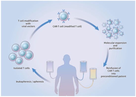 - Shank, B.R.; Do, B.; Sevin, A.; Chen, S.E.; Neelapu, S.S.; Horowitz, S.B. Chimeric Antigen Receptor T Cells in Hematologic Malignancies. Pharmacotherapy 2017, 37, 334–345. [Google Scholar] [CrossRef] [PubMed]