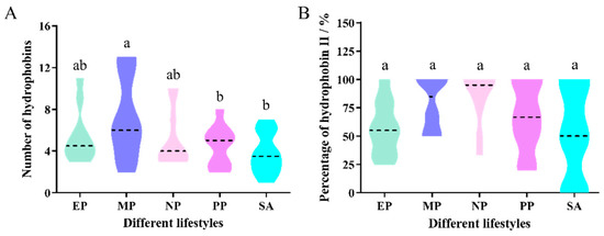 Distribution of hydrophobins in Ascomycota fungi with different lifestyles. (A) Number of hydrophobins in Ascomycota fungi with different lifestyles; (B) Percentage of class II hydrophobins in Ascomycota fungi with different lifestyles. EP, Entomopathogenic fungi; MP, Mycoparasite; NP, Nematode parasitic fungi; PP, Plant pathogenic fungi; SA, Saprotrophic fungi. The black dotted line represents the median. The different letters over the violin indicate the significant difference at p = 0.05.