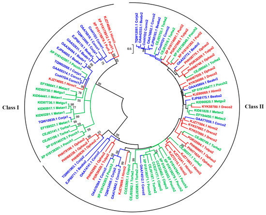 The phylogenetic analysis of hydrophobin proteins of Cordyceps. s.l. ML tree showing the phylogenetic relationships between selected fungal hydrophobins using a WAG + G + I model with MEGA X software. The analysis involved 90 hydrophobin protein amino acid sequences from Cordyceps. s.l. The tree with the highest log likelihood was −9483.0859. Bootstrap support values above 50% are indicated next to the branches. Three families (Cordycipitaceae (blue), Ophiocordycipitaceae (red) and Clavicipitaceae (green)) are presented in the tree. Fungal species are indicated with the following abbreviations: Beauveria bassiana, Beaba; Beauveria brongniartii, Beabr; Claviceps purpurea, Clapu; Cordyceps confragosa, Corco; Cordyceps javanica, Corja; Cordyceps militaris, Cormi; Drechmeria coniospora, Dreco; Hirsutella minnesotensis, Hirmi; Metarhizium acridum, Metac; Metarhizium guizhouense, Metarhizium anisopliae, Metan; Metgu; Ophiocordyceps australis, Ophau; Pochonia chlamydosporia, Pocch; Purpureocillium lilacinum, Purli; Tolypocladium paradoxum, Tolpa; Torrubiella hemipterigena, Torhe.