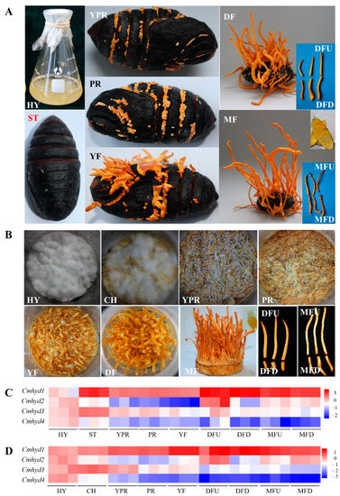 Transcript levels of hydrophobin genes during the fruiting body development. (A) Developmental stages of C. militaris cultured on Antheraea pernyi. HY: the hyphae used for inoculation on A. pernyi; ST: sclerotium (mummified pupae) before stroma development; YPR: the mycelium knot tissue before stroma development; PR: sclerotium with initial stroma (stroma < 1 cm); YF: sclerotium with early stage stroma (1 cm < stroma < 2 cm); DF: sclerotium with developed stroma (stroma > 5 cm); MF: fruiting body with mature perithecia, ascus and ascospores. (B) Developmental stages of C. militaris cultured on wheat media. HY: the hyphae cultured under darkness; CH: the colored hyphae after light irradiation for 4 days; YPR, PR, DF and MF were similar with that cultivated on the insect; MFU: the top fertile part with a superficial visible perithecia; MFD: the sterility stipe. DFU and DFD were the corresponding parts of MF. (C) Heatmap of the transcription levels of hydrophobin genes of C. militaris cultivated on A. pernyi. (D) Heatmap of the transcription levels of hydrophobin genes of C. militaris cultivated on wheat media. The relative expression levels at the different stages were based on the standard levels of the HY stage in the A. pernyi and wheat media, respectively. The different colors of (C) and (D) represent the log10 of gene transcript folds compared with HY.