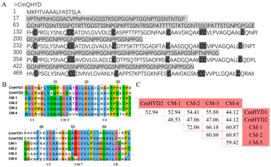 A comparison of the four hydrophobin domains of CmQHYD showed that they had an identity of 60.29–80.88% at peptide level. When the four units were aligned with the two class II hydrophobin proteins, CmHYD1 and CmHYD2, a lower identity (<60%) was observed (Figure 5C).